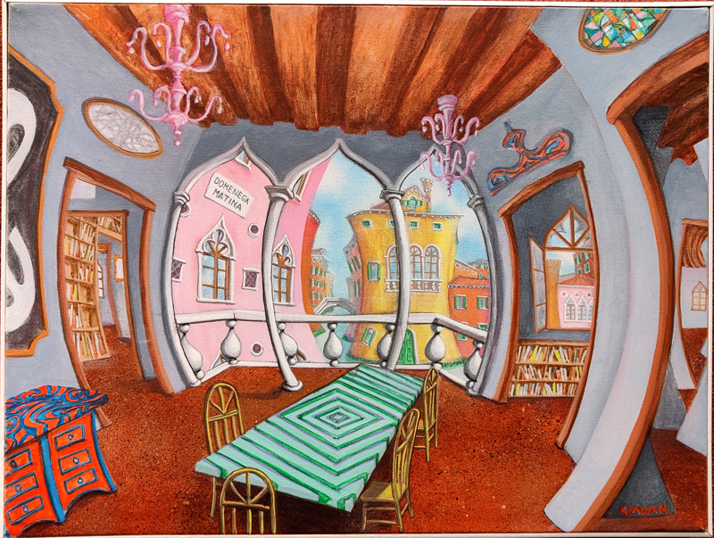 The original GIAGAN canvases seen on this page are at present on view in the gallery BOTTEGA D'ARTE SAN VIO. The captions beneath each image describe the media employed and the support used. Sizes quoted are to be considered without frame.